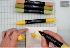 Then I’ll flip it over to color on the de-bossed side. You may color with whatever you have. I used blending brushes in the completed photo and Stampin’ Blends in the video.