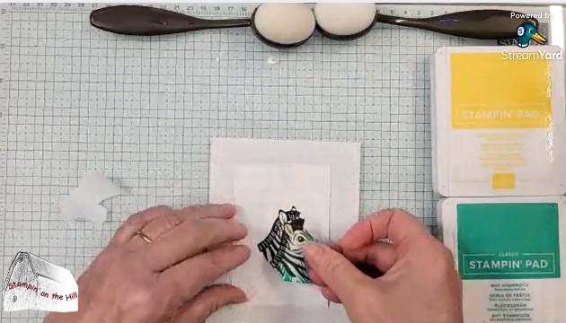 I select the image I want to be in the foreground and start by making a mask. I’m using masking paper, but you may use a post-it note instead. Just be sure to stamp where it’s sticky on the back. When I cut, I am undercutting just a little so the image has a little left on the waste piece.