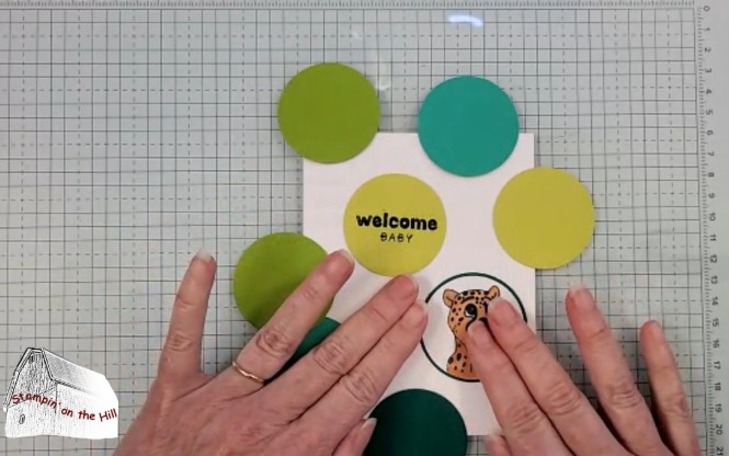 Stamp a greeting on one of the remaining circles and adhere. Then adhere the rest of the circles randomly.