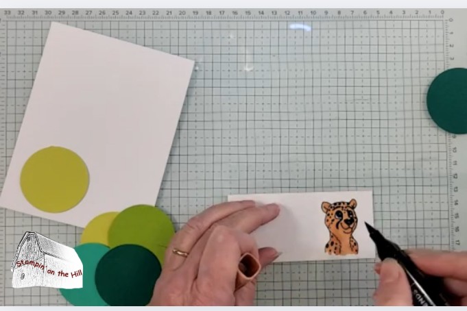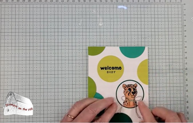 Stamp an animal image onto Basic White scrap, color with Stampin’ Blends and punch with 1-7/8″ circle punch. Adhere this to the 2″ circle, then to the card front.
