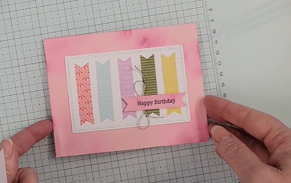 Then I punched out the greeting banner from the ink-blended extra piece. Using linen thread, I tied a big, loopy bow and attached it to the back with a glue dot. I then adhered the greeting to the card front with dimensionals.