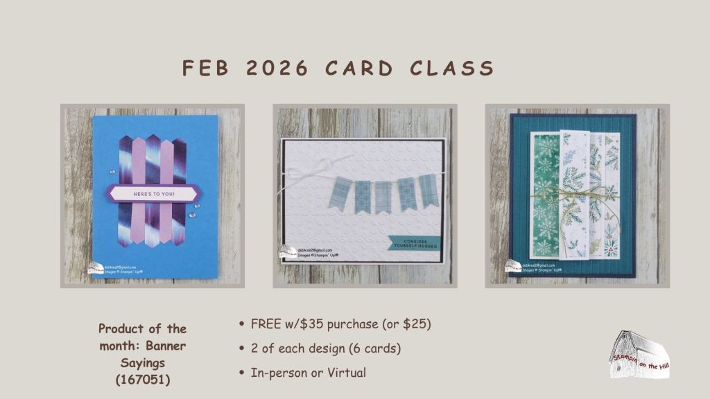 I just can’t stop playing with this bundle: Banner Sayings (167051). I’ll be using this bundle for the February class, both in-person and virtual. By purchasing this bundle, I will provide all of the consumable products to create 6 other cards (2 each of 3 designs) for FREE! Registration closes on January 31.