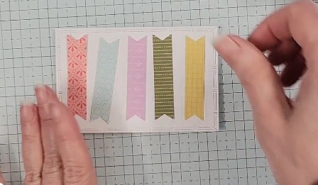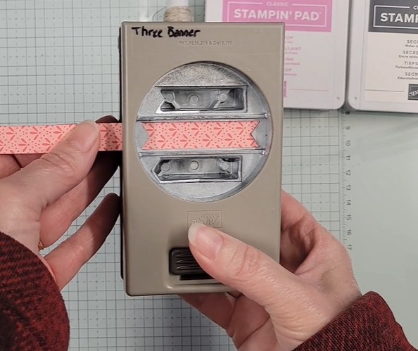 Using the B side of Floral Impressions DSP, I first cut 3/8″ strips, then punched out five different patterns with the middle banner option of the Three Banner Punch.