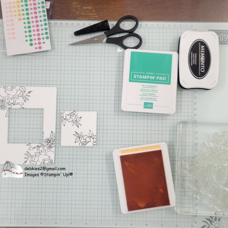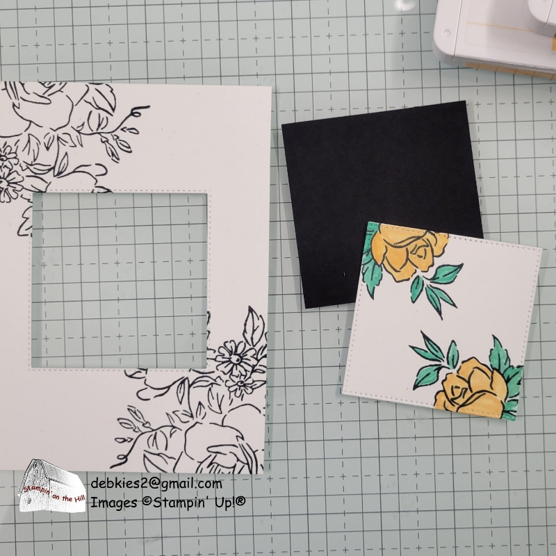 First I stamp the image a couple of times in black on white cardstock. Then cut out a portion to be spotlighted. I used a die from Stylish Shapes to cut out a square.