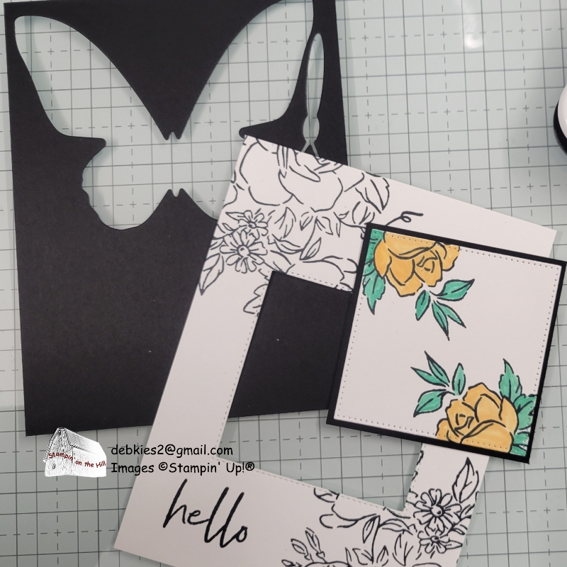 Then I mounted the original white layer onto a slightly larger black mat and adhered to the card front (Peach Pie). Note: I was able to use a scrap that a butterfly had previously been cut out of because all I really needed was that outer edge to show.