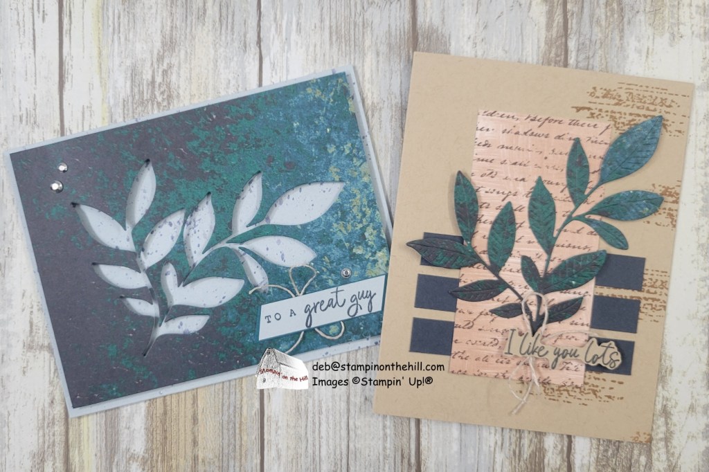 For the second card, I stamped some background graphics on the Crumb Cake card base with Pecan Pie ink. I added three 3-1/4″ x 1/2″ Secret Sea strips across the lower half and a 2″ x 4″ piece of DSP over the top. I then added the cut-out leaves from the first card with dimensionals on the top four leaves only and glue on the rest. I fussy cut the greeting and added some Linen Thread behind it. This is adhered with dimensionals too.