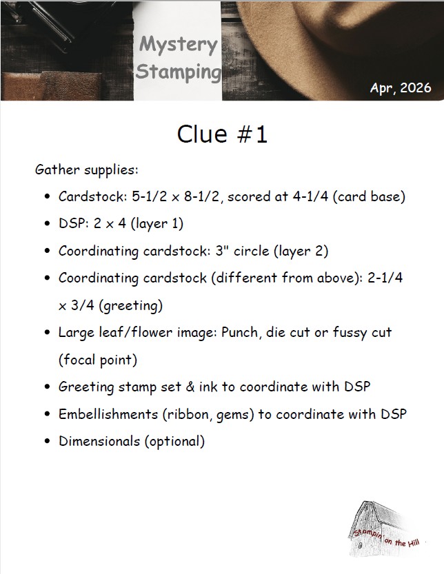 Gather your supplies and follow the Facebook link above next Wednesday. I will reveal each clue slowly so you can craft along. After all the clues have been revealed, the mystery has been solved. I will show the card I used as inspiration and you are encouraged to post a photo of the one you made.